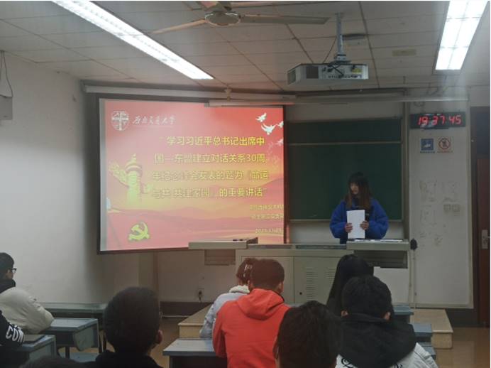 会上,党支部书记向雨晴同志首先向大家介绍了本次会议的主要内容,并回顾了《命运与共 共建家园》的重要讲话,讲话提出“共建和平家园”“共建安宁家园”“共建繁荣家园”“共建美丽家园”“共建友好家园”五点建议,为深化中国—东盟友好合作关系,促进共同发展繁荣不懈努力。向雨晴同志指出自1991年建立对话关系以来,山水相连、血脉相亲的中国和东盟聚焦共同发展、推进合作共赢,如今已成为最成功、最具活力的地区合作样板。中国和东盟关系已成为区域合作的典范,对打造更高水平的中国东盟战略伙伴关系,构建更为紧密的命运共同体具有重要意义。