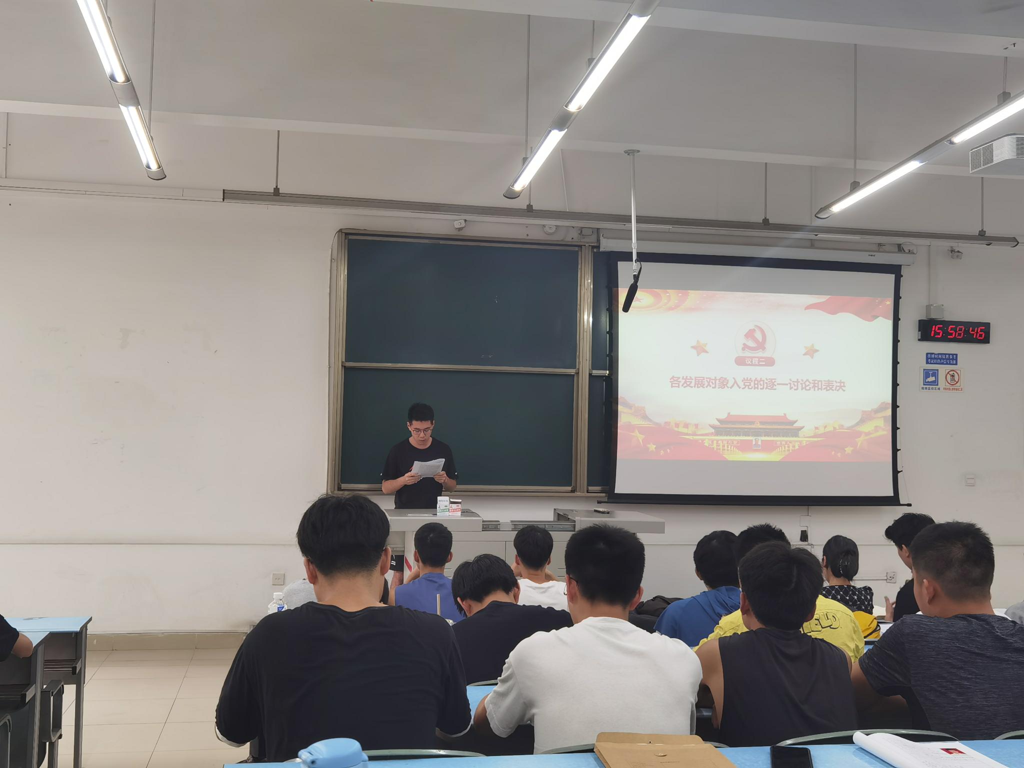 会议开始,冯毅铭同志介绍了本次会议召开的目的和流程。本次大会共分为七个部分:发展对象做自我介绍并宣读入党志愿书;第一介绍人发表介绍意见;第二介绍人发表介绍意见;党支部委员会(党支部)报告对发展对象的考察及政审情况;其他党员(积极分子或群众)对发展对象提出意见建议;发展对象对以上意见表明态度;有表决权的正式党员进行无记名投票表决。