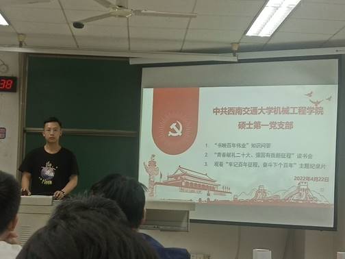 2022年4月22日,BBV体育_BBV(中国)硕士第一党支部在逸夫馆4404B开展“青春献礼二十大,强国有我新征程”主题党日活动,活动内容共三项:“书映百年伟业”知识问答、“青春献礼二十大,强国有我新征程”读书会以及观看“牢记百年征程,奋斗下个百年”主题纪录片。本次会议由孙舰凯同志主持。