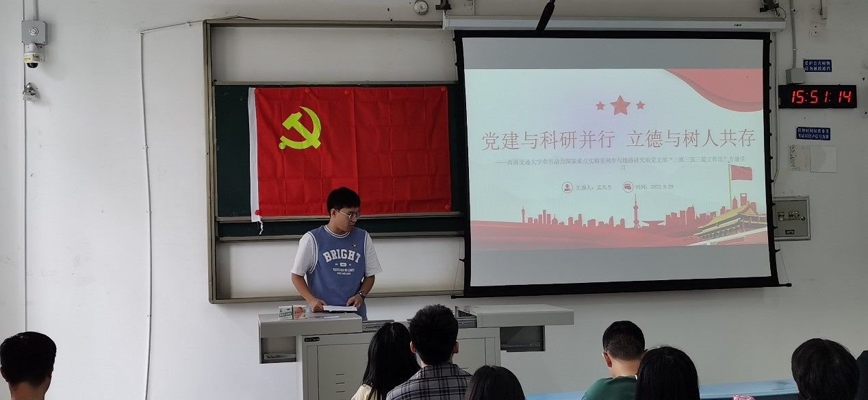 李怀东同志带领我们学习了本次党代会报告的内容,介绍了全国人大代表翟婉明院士的求学、兢兢业业的工作经历;教书育人,更帮助青年学生树立理想抱负的感人事迹;以及西南交通大学要建设世界一流高校,轨道交通领域的第一名的未来规划。希望全体学生都能为学校的建设,国家的建设添砖加瓦。