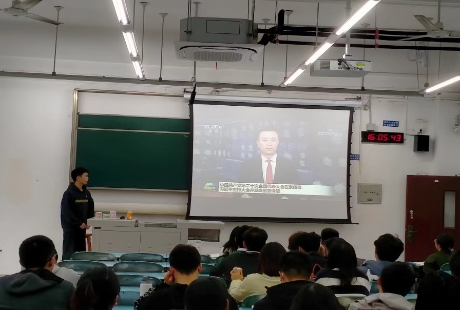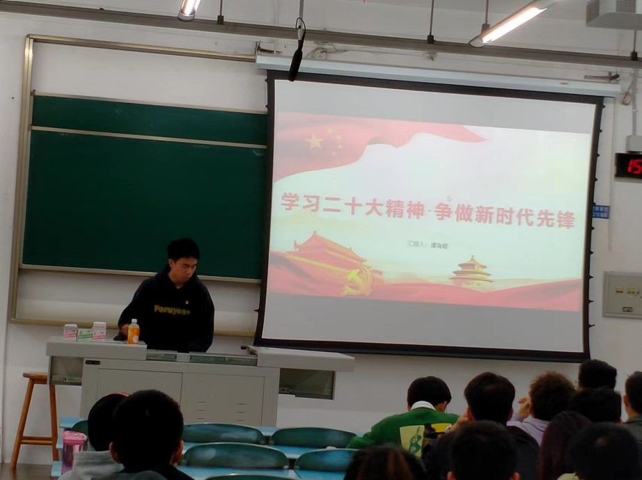 谭海蛟同志首先介绍了二十大概况、主题、议程等,然后带领支部党员全面解读二十大报告,着重解读了过去五年的工作和新时代十年的伟大变革和新时代新征程中国共产党的中心任务:团结带领全国各族人民全面建成社会主义现代化强国、实现第二个百年奋斗目标,以中国式现代化全面推进中华民族伟大复兴。随后,以习近平总书记对青年的寄语为切入点,会议号召全体党员同志争做先锋青年,坚定人生理想,乐做人民公仆,践行使命担当。最后,观看二十大闭幕式相关报道。
