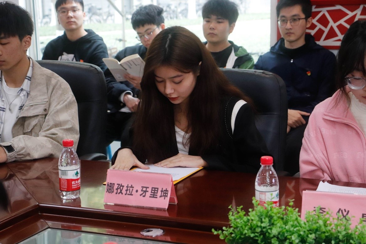 学生党员代表娜孜拉•牙里坤同志与李仪卓同志结合自身的生活、工作等经历,对这十年间所发生的伟大变革向大家分享了自己的想法;作为一名新疆人,娜孜拉•牙里坤在分享家乡十年变化的同时,她表示,如今的新疆社会稳定、经济发展、环境优美,与全国人民一道迈入全面小康社会的美好愿景之中,真正实现了新疆工作长治久安的总目标;李仪卓同志从我们每个新时代十年的亲历者的角度,向我们展示了十年来“我”与祖国共同跋涉、奋进发展的剪影,并表示:2023年是全面贯彻党的二十大精神的开局之年,广大青年要坚定不移听党话、跟党走,怀抱梦想又脚踏实地,敢想敢为又善作善成,立志做有理想、敢担当、能吃苦、肯奋斗的新时代的好青年。