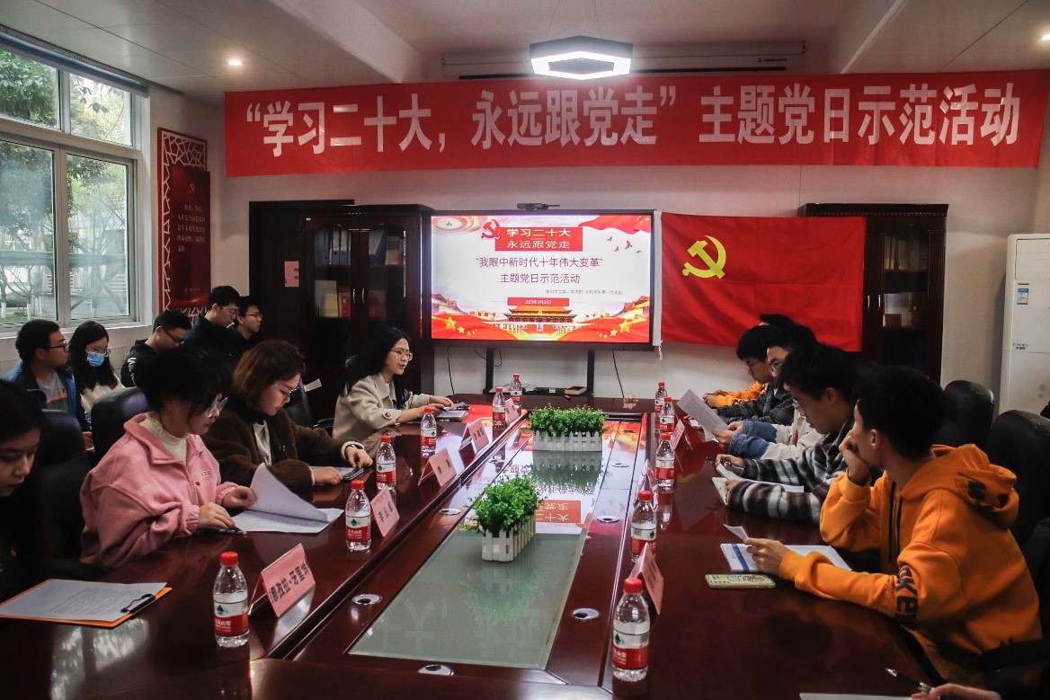 首先,全体与会党员集体学习了二十大报告中“新时代十年的伟大变革”相关内容,在熊瑜、郁章乐、王伟梁、樊昱豪、吴晨曦等同志的带领下对二十大报告原文进行了再次学习、巩固,并结合《非凡十年》视频学习,对这十年的成就和变革意义有了更加深刻的认识。