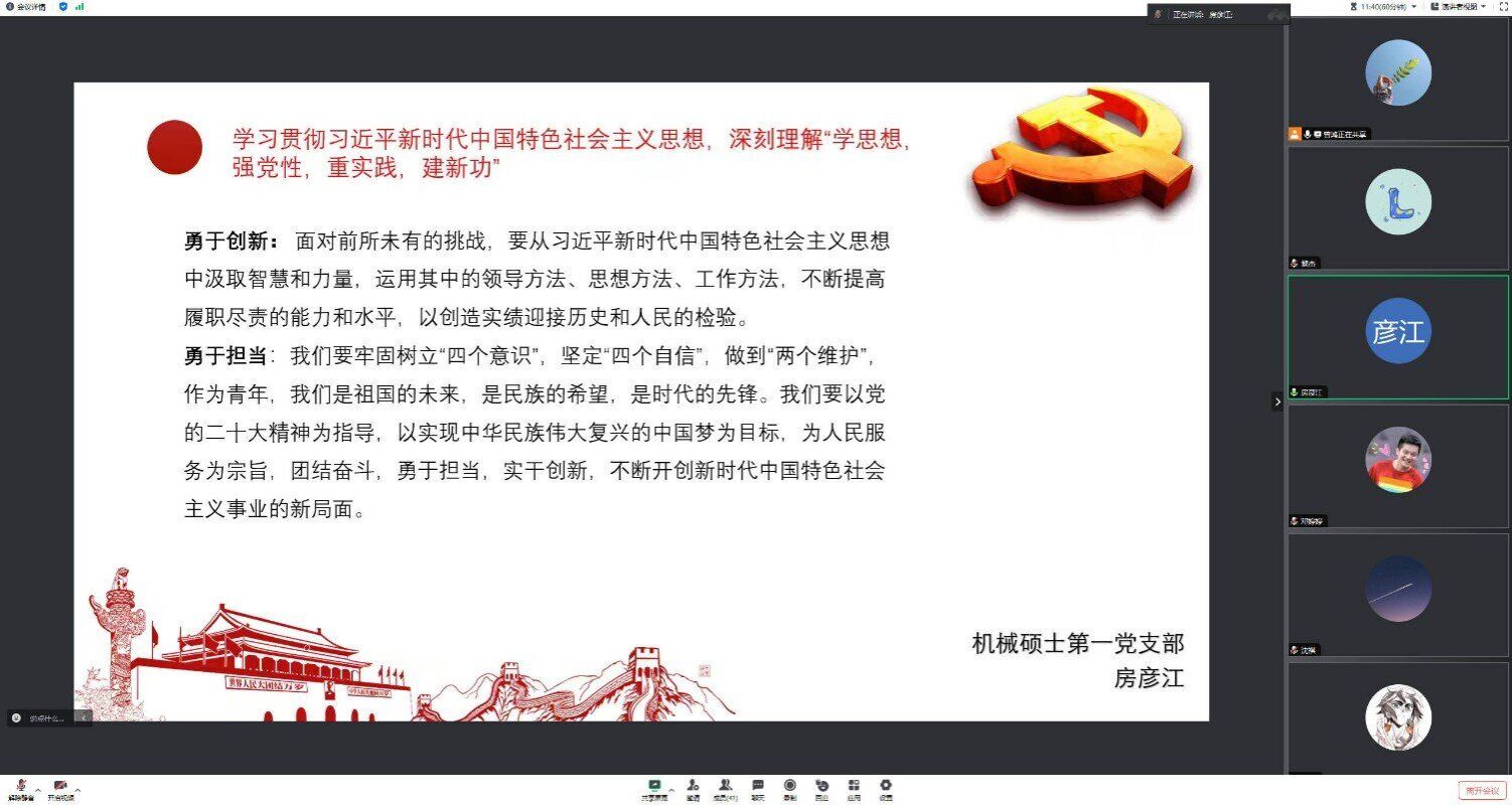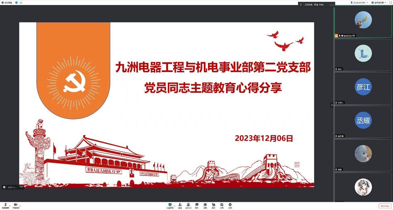 2023年12月6日,BBV体育_BBV(中国)硕士第一党支部在线上与九洲电器工程与机电事业部第二党支部共同举行主题教育活动——“学思想、强党性、重实践、建新功”学习贯彻习近平新时代中国特色社会主义思想。活动内容共三项:第一项:党员主题教育学习分享。第二项:九洲电器工程与机电事业部第二党支部特色活动介绍及党建经验分享。第三项:观看主题教育学习视频。本次会议由曾鸿同志主持。