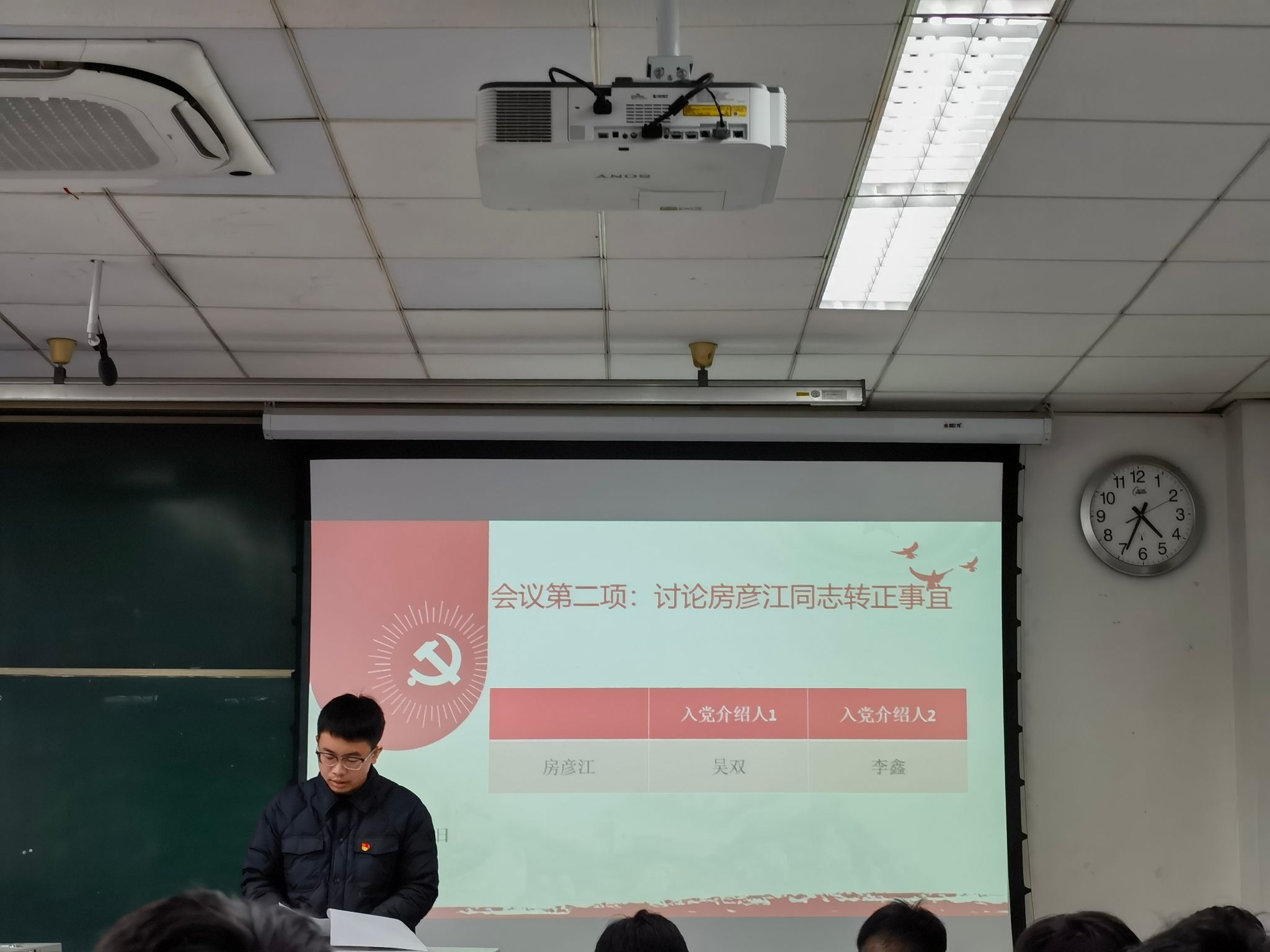曾鸿同志陈述了房彦江同志在发展期间的表现,通过预备期间的培养和考察,总结了这些同志在思想上的进步。随后,由房彦江同志上台汇报自己在此期间的体会、收获、不足之处以及今后如何克服。然后,该同志的入党介绍人总结其在预备期间的表现。