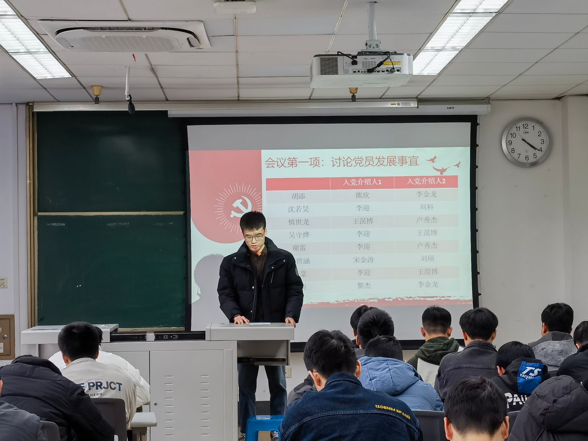 首先,曾鸿同志通报了到会党员人数,到会人数符合相应规定,陈述了胡添、沈若昊、慎世龙、吴守烨、谢雷、薛世涵、杨豪、殷爽八位同志在发展期间的表现,通过发展期间的培养和考察,总结了这些同志在思想上的进步。随后,由这八位同志依次上台汇报自己在此期间的体会和收获,并对入党动机、政治信仰、理想信念等方面的内容进行详细陈述,然后由各同志的入党介绍人总结其在培养期间的表现。