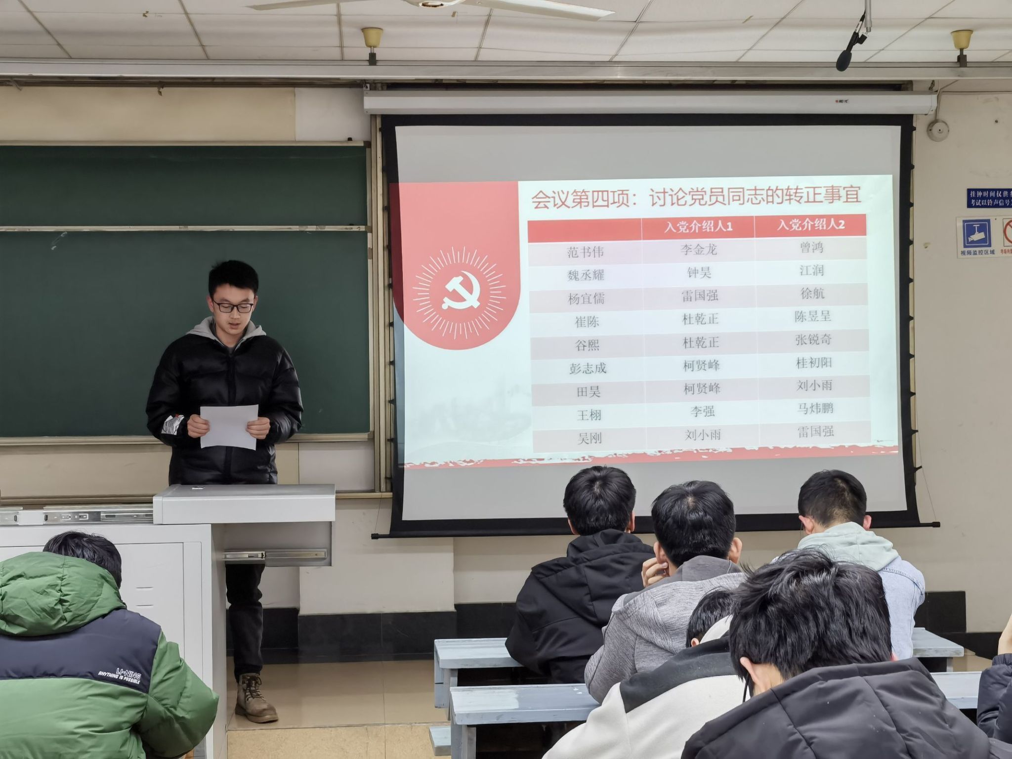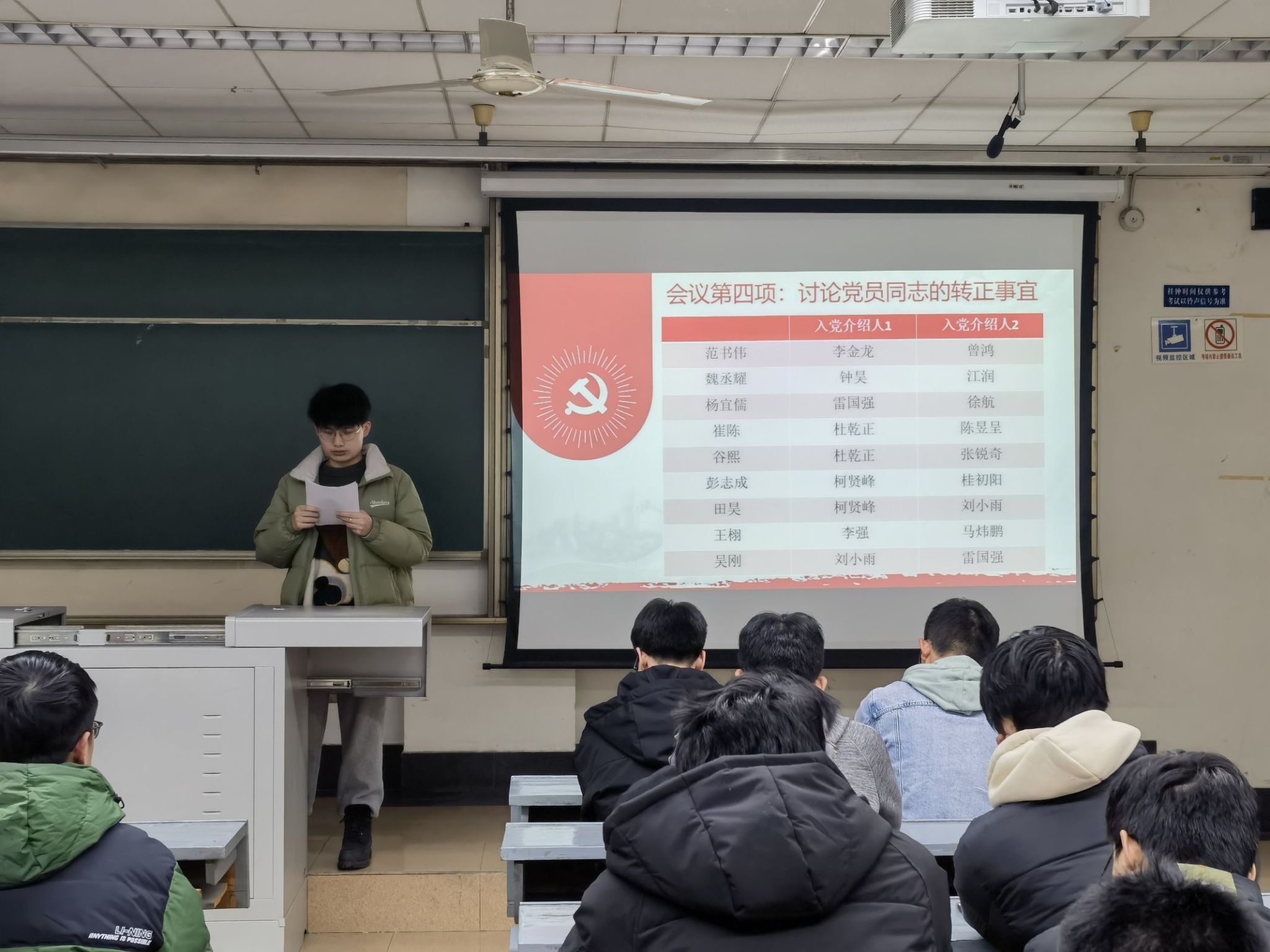 曾鸿同志陈述了范书伟、魏丞耀、杨宜儒、崔陈、谷熙、彭志成、田昊、王栩、吴刚九位同志五位同志在发展期间的表现,通过发展期间的培养和考察,总结了这些同志在思想上的进步。随后,由这九位同志依次上台汇报自己在此期间的体会和收获,并对入党动机、政治信仰、理想信念等方面的内容进行详细陈述,之后由各同志的入党介绍人总结其在培养期间的表现。