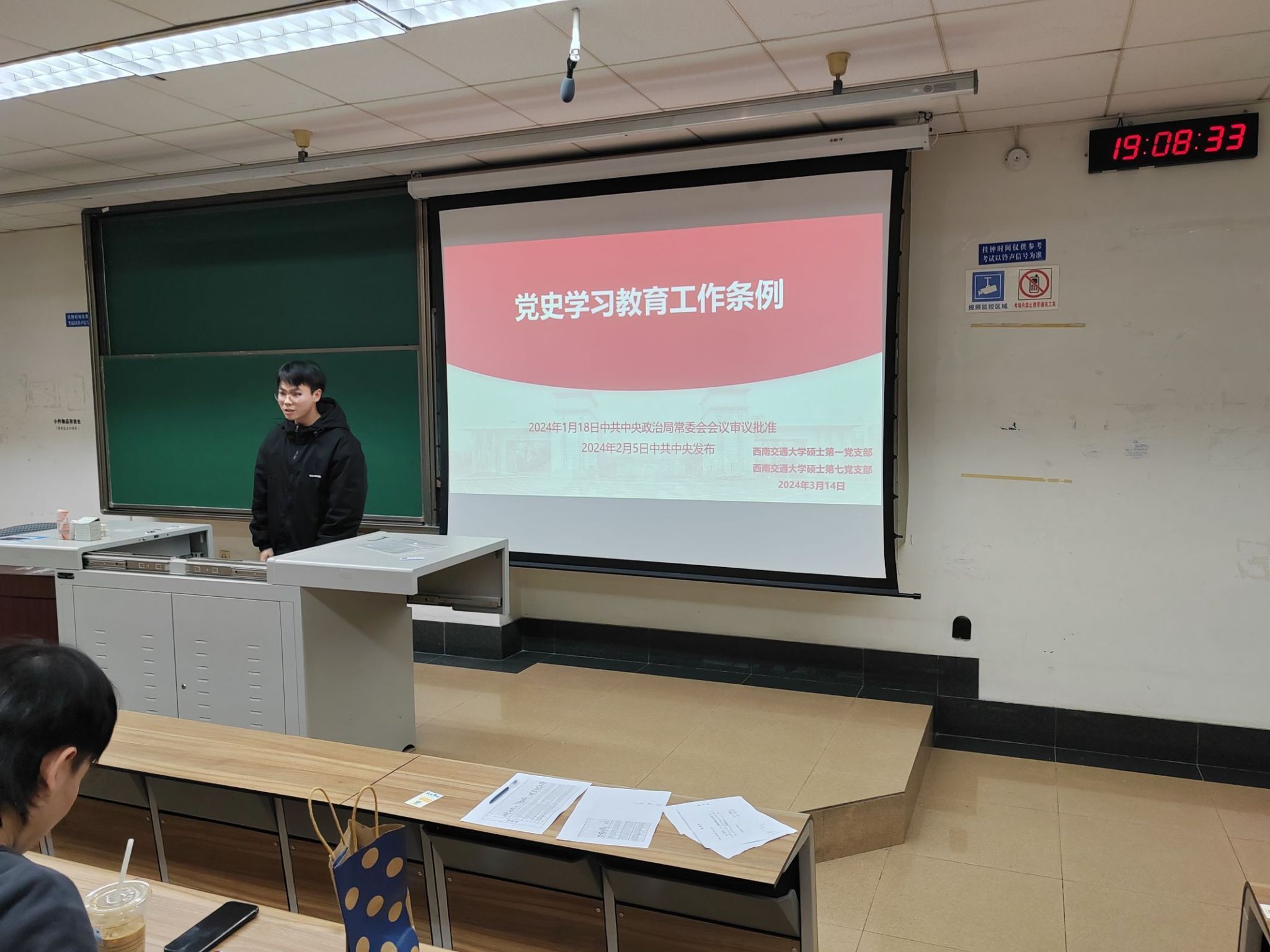 2024年3月14日,BBV体育_BBV(中国)硕士第一党支部与第七党支部在九里校区4号教学楼J4224进行支部共建交流学习。活动内容共三项:第一项:学习习近平总书记在中共中央政治局第十一次集体学习时的重要讲话;第二项:学习《党史学习教育工作条例》;第三项:学习教育部党组书记、部长怀进鹏在《求是》杂志发表的署名文章《厚植爱国情怀 培育时代新人》。本次会议由曾鸿同志主持。