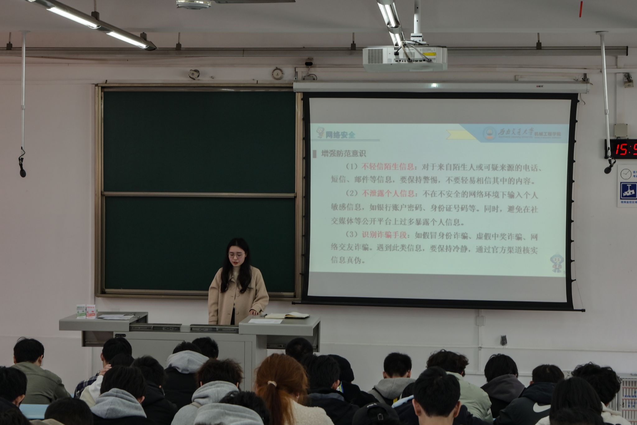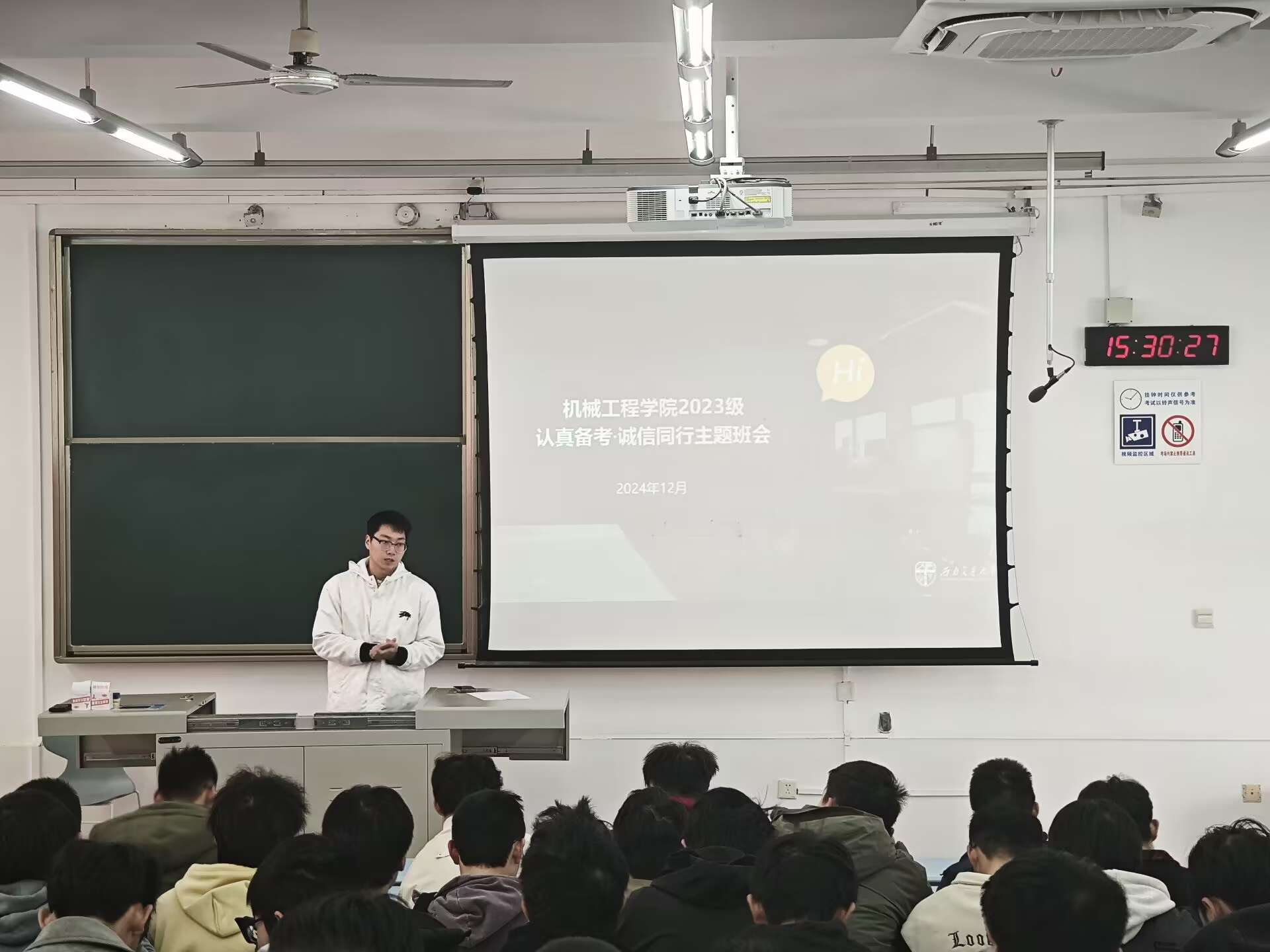 大会主要内容包括近况分析,考试诚信教育,寝室安全,交通安全,网络安全和诈骗宣传。会上,辅导员首先对上半学期的教学工作与学生成绩进行了全面总结,肯定了同学们在学业与校园活动中的出色表现,同时针对学习中的薄弱环节提出改进建议,鼓励同学们积极进取,为期末考试和未来的学业奠定坚实基础。会上老师强调了期末时诚信考试的重要性,之处诚信乃立身之本,更是学术研究的基石。学校将进一步加强考风考纪建设,严格考试管理机制,对任何形式的作弊行为绝不姑息,以维护教育的公平性与严肃性,确保每位同学都能在公平的环境中展示自己的真实水平,凭借自身努力收获知识与成长。