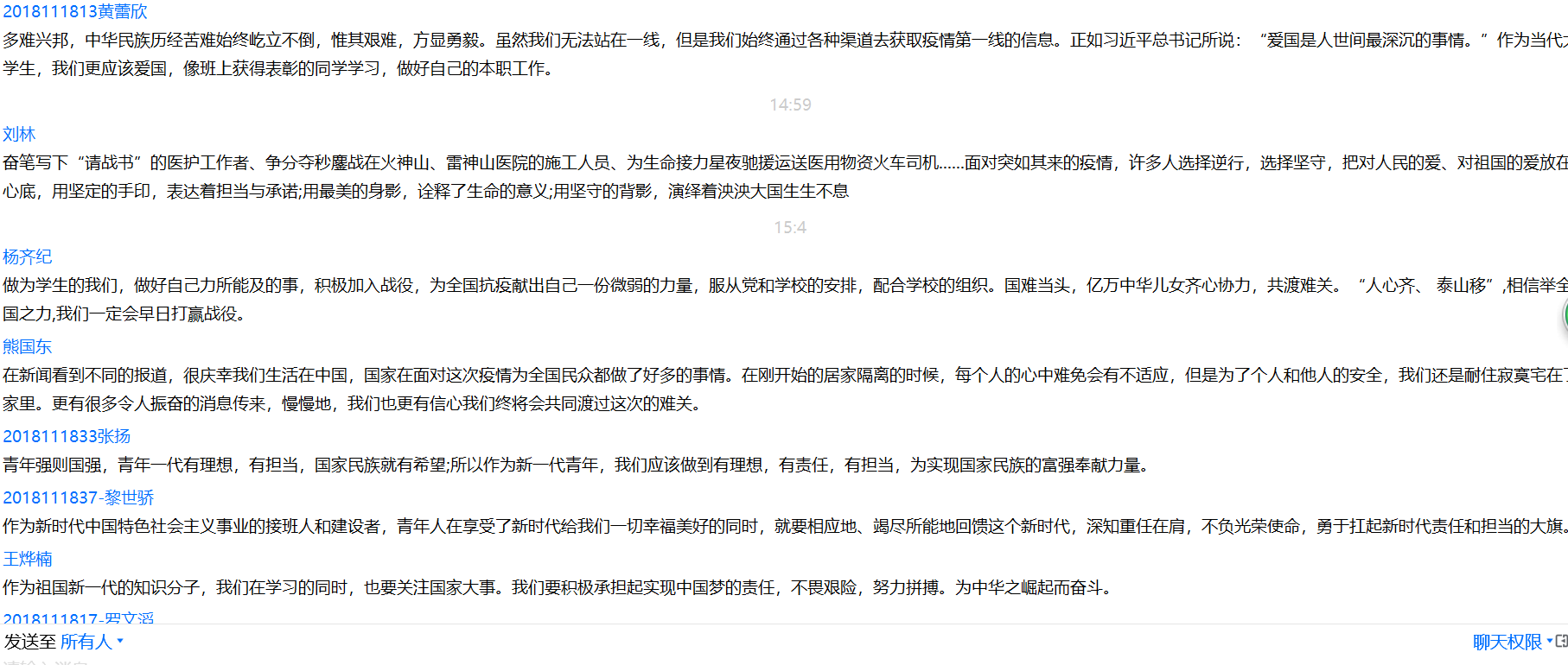 接着按照流程分别进行典型学习,参与“青春告白祖国”等活动。最后,同学们就本次疫情下的中国展开了热烈的讨论。