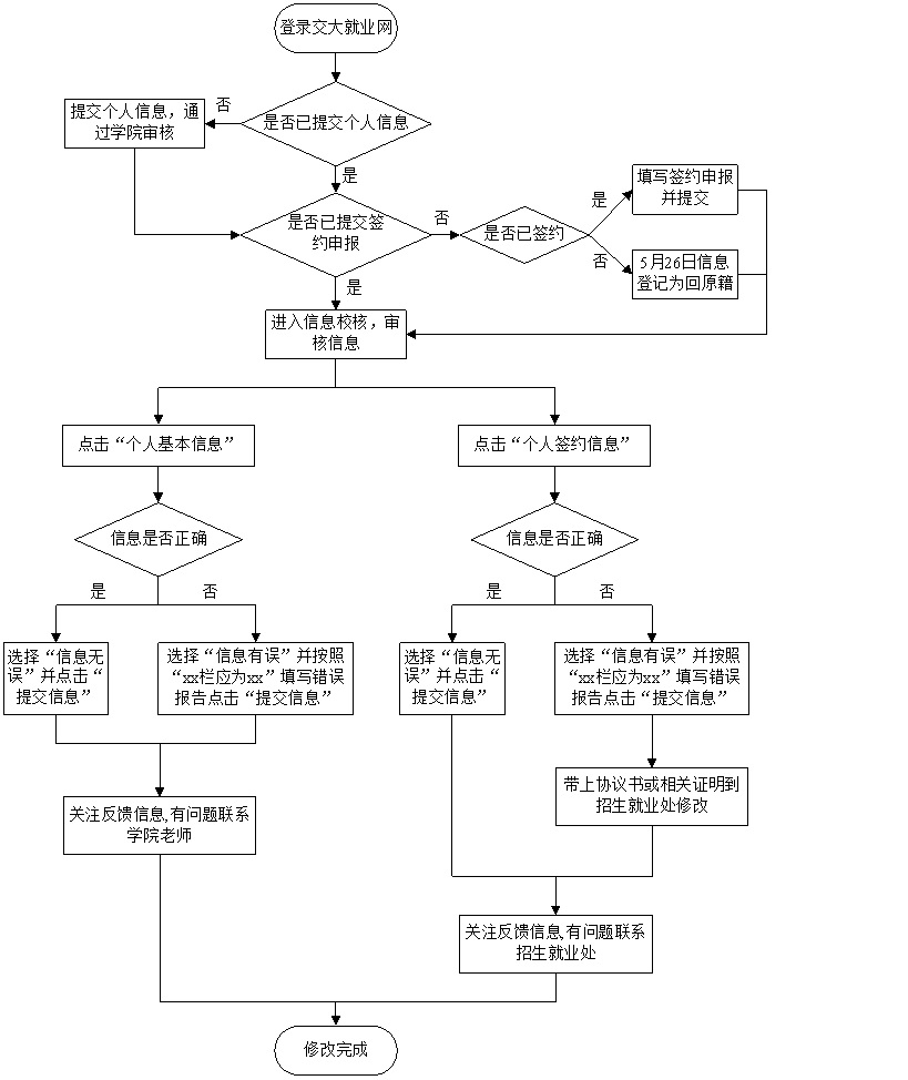 5、签约信息有误的,请在提交校核结果后,带上就业协议书及相关证明到招生就业处进行网上就业信息现场修改,否则信息将无法更正。