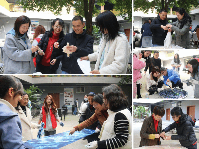 扎染过程中,在场女教职工个个热情高涨,手法娴熟,通过夹板、雪糕棒、弹珠、皮筋、形板等工具,扎染出云纹、卷上纹、几何菱形、波点纹等各式各样的图案,活动现场欢声笑语、其乐融融。