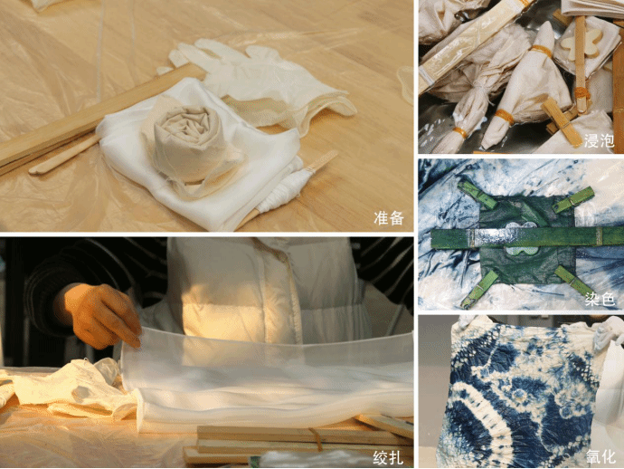 “扎染古称扎缬、绞缬,古代常见的防染印花纺织品有绞缬、蜡缬和夹缬等种类。”赵菁给大家讲解扎染艺术的历史渊源、独特魅力和技法工艺。扎染分为扎结和染色两部分,通过纱、线、绳等工具,对织物进行扎、缝、缚、缀、夹等多种形式组合后进行染色。经过绞扎、浸泡、染色、氧化、呈现的步骤后,便得到了一副独一无二的扎染作品。