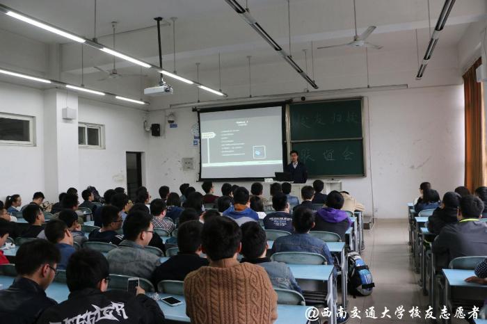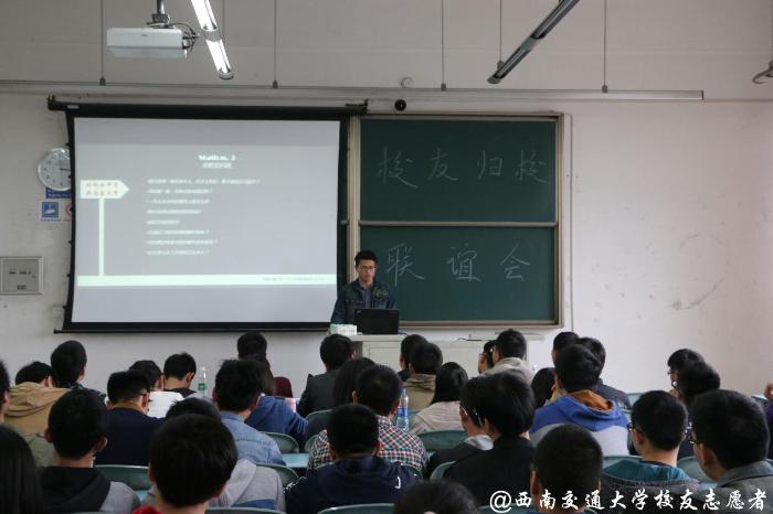 3月28日下午3点,由西南交通大学校友者愿者协会举办的“迎校庆一汽-大众校友归校联谊”在x2333准时举行。高辉、李捷、张剑锋、于泰州、蒋耀、罗华等六位校友参加了这次活动,他们此行的主要目的是为即将踏入社会的大三研二学生提供就业参考和指引。李捷担任活动主持。