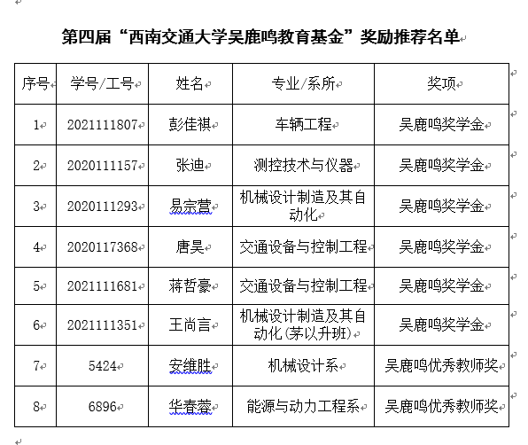 第四届“西南交通大学吴鹿鸣教育基金”奖励评选结果公示