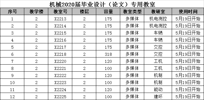 根据2020届毕业设计(论文)工作总体安排,学校为各学院配备了专用教室作为毕设(论文)指导和答疑专用场地,现将学院各教研室专业毕设(论文)指导和答疑专用场地安排如下:
