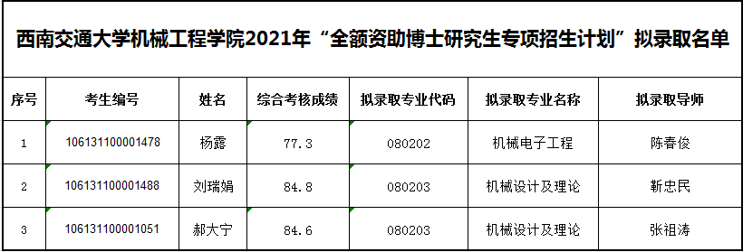 根据《BBV体育_BBV(中国)2021年博士研究生招生复试及拟录取工作实施细则》及《西南交通大学“全额资助博士研究生专项招生计划”实施方案》要求,按拟录取成绩依次递补,现将BBV体育_BBV(中国)全额资助博士研究生拟录取名单公示如下: