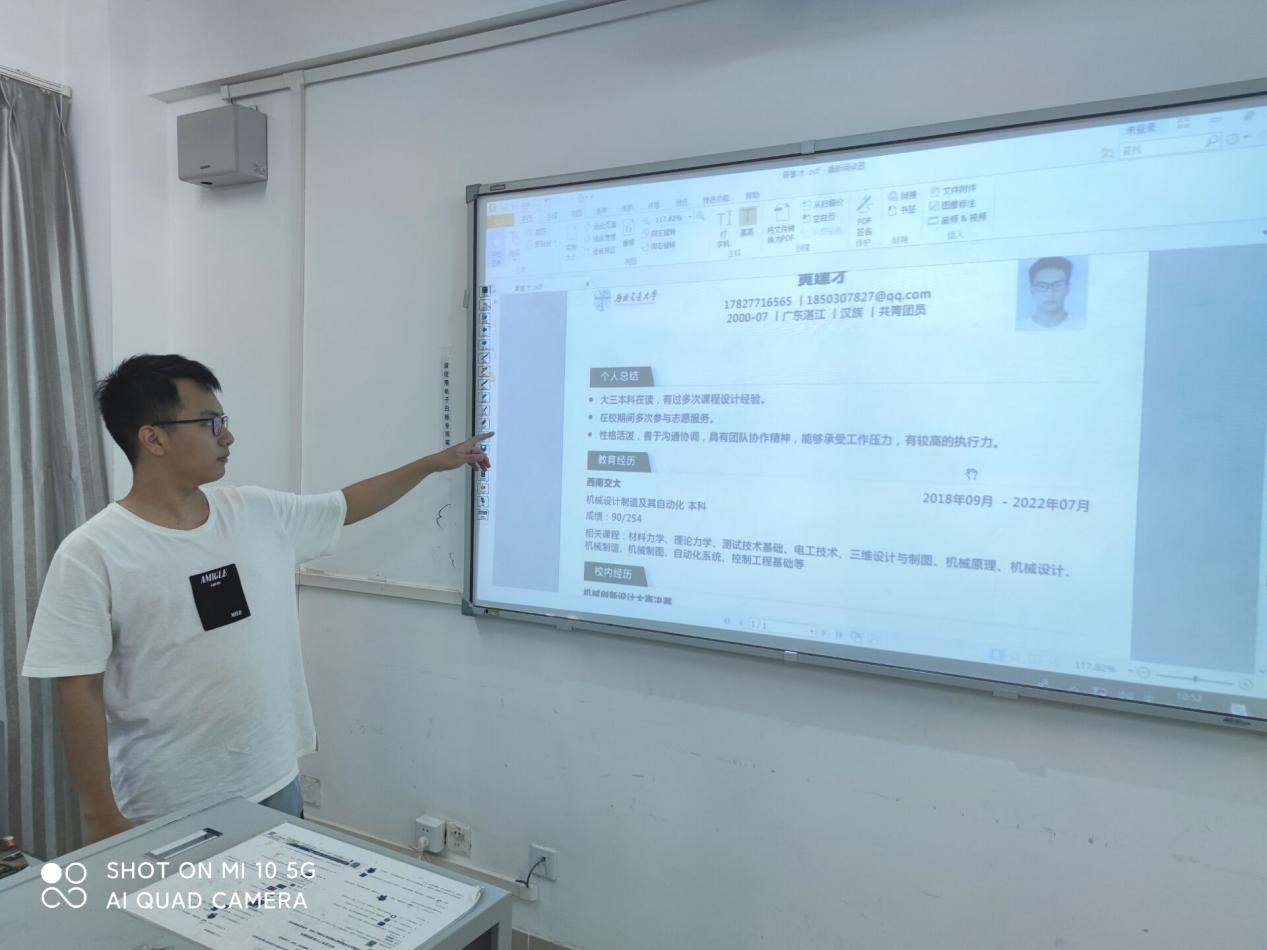上午10:00,唐超毅同学开始介绍自己的简历,唐超毅同学讲到“个人求职简历要把自己的优势与招聘公司的需求相结合”。随后马子非和刘浜同学从各个方面强调了简历制作方面的问题。最后,柴渊、刘禹恒、曲江鹏、黄建才同学分别从证件照、社会实践、学校公司logo、兴趣爱好等方面分享了自己简历制作的经验。突出强调了将自身兴趣爱好与相关工作相结合,学会换位思考,从HR的角度来审视自己的简历等简历制作的小技巧和注意事项。