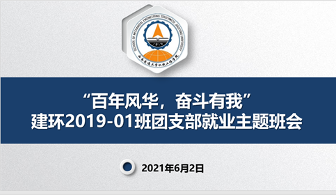在中国共产党成立100周年之际,为引导本团支部团员及青年认真学习领会习近平总书记对大学生勇担时代使命、把个人的理想追求融入党和国家事业之中的殷切期望,认真规划个人学业和职业道路,尽早开启职业生涯探索之旅,提前做好职业生涯各项准备。在学校就业处以及BBV体育_BBV(中国)团委的带领下,建环2019-01班团支部组织开展了本次“百年风华 奋斗有我” 就业主题活动,于2021年6月2日下午第二讲在x2113教室进行了本次主题主题班会。