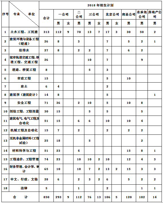2018年集团大学生招收计划为850人,涉及土木、财务、中文、法律、安全、暖通、给排水、机械、电气、造价、材料、道桥、岩土、轨道交通、建筑学、市政等18个专业(见附表)。