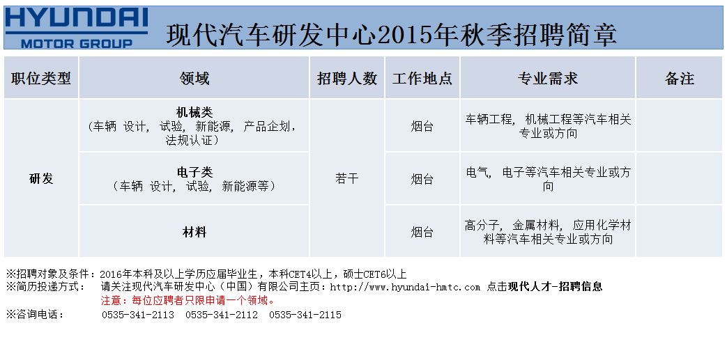 现代汽车研发中心(中国)有限公司 2015年秋季招聘