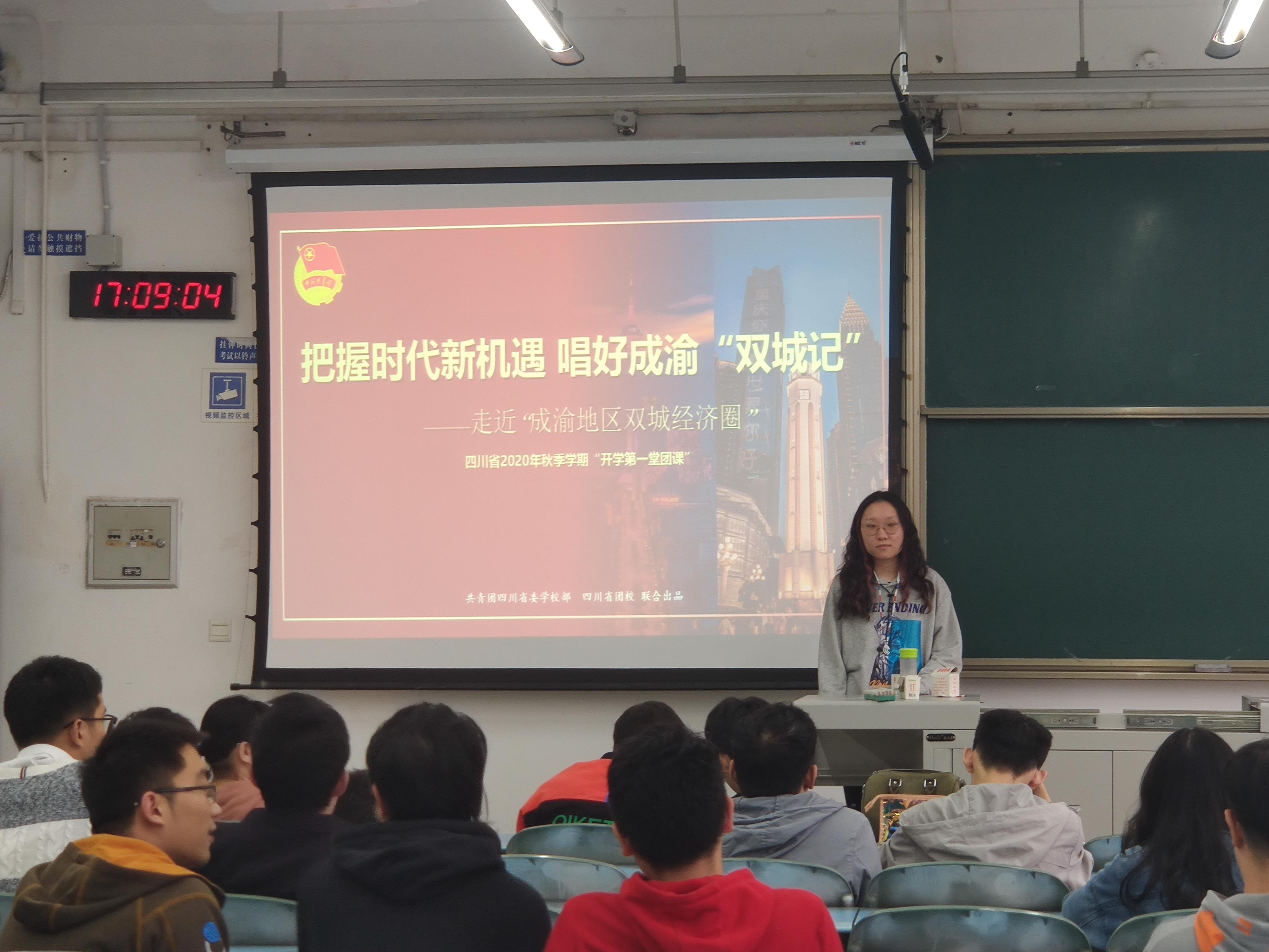 团课中首先是全体参课人员集体奏唱团歌,并且集体阅读了《团团致四川学子的一封信》,全体人员认真领悟了其中的思想。之后主持人刘腾帅同学带领大家学习了《带你走近“成渝地区双城经济圈”》团课PPT,主持人给大家讲解了PPT的大致内容,学习期间大家根据PPT内容发表了自己的看法,在班级内进行了广泛的交流。学习PPT过后大家观看了《团团说唱节约美德》视频并且集体宣誓做“厉行节约,反对浪费”的倡导者、践行者。团课最后大家学习了青年大学习网上主题团课。