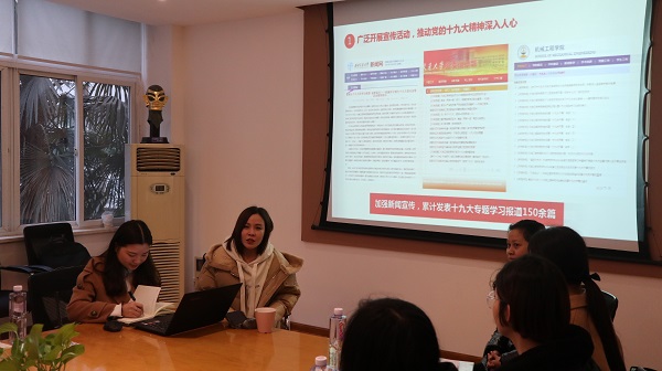 西华大学马克思主义学院党建工作室站长熊悦汐同志首先表示这次能到BBV体育_BBV(中国)来作十九大经验交流是一次难能可贵的学习机会,她认为我院党建工作的经验做法值得学习和借鉴,并希望今后与我院要继续加强党建工作交流,相互借鉴,优势互补,携手共进。西华大学马克思主义学院党建工作室副站长邹颖同志结合自己下乡扶贫时的经历,谈到一位贫困村里的共产党员主动把贫困户指标让给别人,自己甘愿住破旧茅草屋的故事,勉励党员同志要有奉献精神,要有大局意识,要勇于担当自己的使命,作为党员要结合自身不断学习,为社会发展、国家的昌盛贡献自己的一份力量。