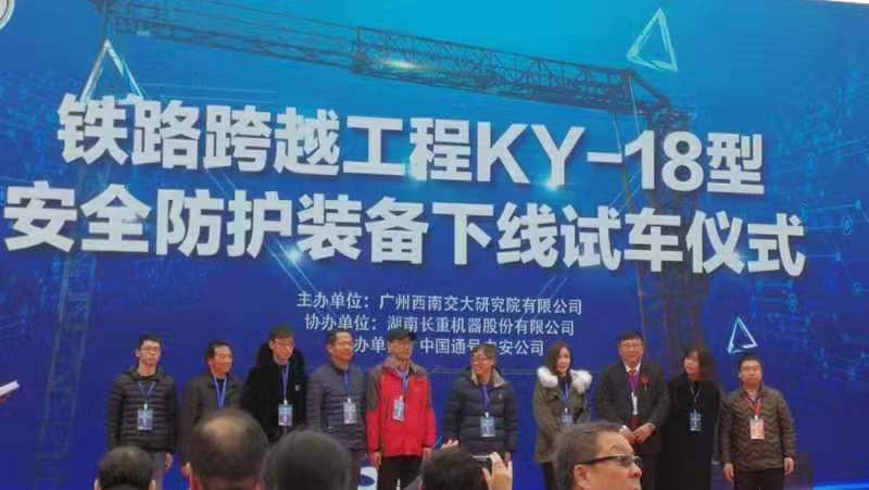 由广州西南交大研究院有限公司与西南交通大学机械工程学院、牵引动力国家重点实验室及经管学院联合研发设计,湖南长重机器股份有限公司承造生产的“铁路跨越工程KY-18型安全防护专用装备”于1月6日上午正式下线试车。中国中铁股份有限公司副总工朱本珍、湖南省工信厅装备处副处长夏立斌、长沙市工信局副局长吴宏亮、西南交通大学原副校长张文桂、对外合作与联络处处长谭建鑫等出席了下线试车仪式。