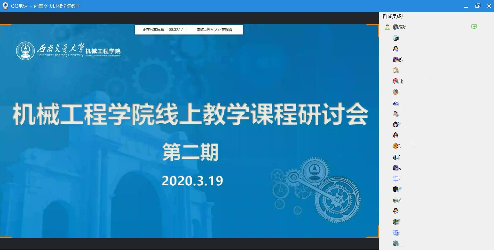 为持续了解学院线上教学情况,搭建交流平台,确保停课不停学取得良好效果,2020年3月19日下午14:30开始,学院在教工QQ群举行第二期线上教学课程研讨会。研讨会由副院长田怀文主持,各系所教研室共计100余名教师通过QQ网络直播参与线上教学研讨会。