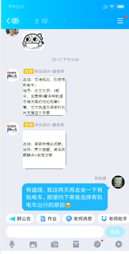 到目前为止毕业设计能做到这个进度,与毕设指导老师唐阳老师的悉心指导是分不开的。虽然受到疫情的影响,无法返回学校,但唐阳老师依然会在QQ群里每周一次地举行线上答疑会议,每周我们都会在群里通过电脑对毕业设计进度进行报告,而唐老师也会了解同学们的毕设进度情况,对每一位同学进行悉心地指导,及时地纠正同学们的毕设方向,给出建设性意见,避免同学们多走弯路。