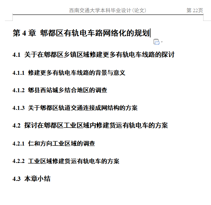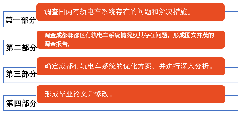 答:本论文会在细节和宏观两大方向上对成都有轨电车系统进行优化,通过网上调查的结果显示,民众普遍认为目前有轨电车蓉2号线最大的问题是速度缓慢,与其他交通工具相比没有优势。细节方面会分析蓉2号线速度缓慢的原因并提出具体方案进行解决;宏观方面会对蓉2号线进行扩线,让有轨电车覆盖到郫都区更多的地方,方便民众出行,并且探讨在郫都区工业园区建设货运有轨电车的可能性。