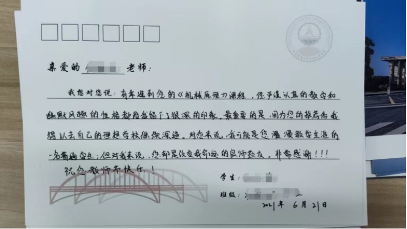 我想对您说:有幸选到您的机械原理课程,您严谨认真的教学和幽默风趣的性格都给我留下了很深的印象。最重要的是,因为您的推荐使我得以去自己理想学校继续深造。对您来说,我可能是您漫漫教学生涯的一名普通学生,但对我来说,您却是改变我命运的良师益友,非常感谢!!!祝您教师节快乐!