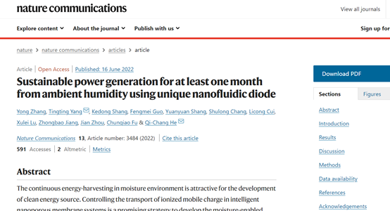 近日,我院摩擦所何其昌教授团队青年教师杨婷婷副研究员,在Nature Communications上发表了题为《Sustainable power generation for at least one month from ambient humidity using unique nanofluidic diode》的学术论文。该论文的第一作者为BBV体育_BBV(中国)博士研究生张勇,共同通讯作者为杨婷婷副研究员和何其昌教授。