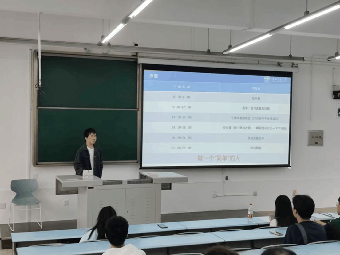 第一位嘉宾张军,本科车辆工程,考研专业车辆工程。他提醒大家早做准备,切忌临考磨枪,要打有把握的仗。尤其给人留下深刻印象的是他所展示的自己在考研期间的一张作息表,从早上七点到晚上十点排的十分充实,他强调在考研期间“做一个‘简单’的人”,排除不必要的干扰因素,遇到问题及时调整自己,专心致志、脚踏实地地做好自己就一定能够收获成功。