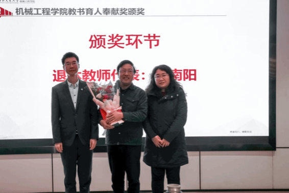 首先进行的是“教书育人奉献奖”颁奖仪式。自学院2020年设立教书育人奉献奖,已经有26位老师获得次奖项。袁艳平书记为教师代表余南阳老师颁发了学院定制专属的“教书育人奉献奖”荣誉奖杯,孙亮亮老师献上鲜花,以感谢把青春和智慧都用在了学院的人才培养、科学研究、事业发展过程中,为学院的发展做出了独特而重要的贡献的退休老师们。希望老师退休不褪色、退休不退志,继续关心支持学院工作,发挥余热、建言献策,为学院发展建设贡献智慧和力量。