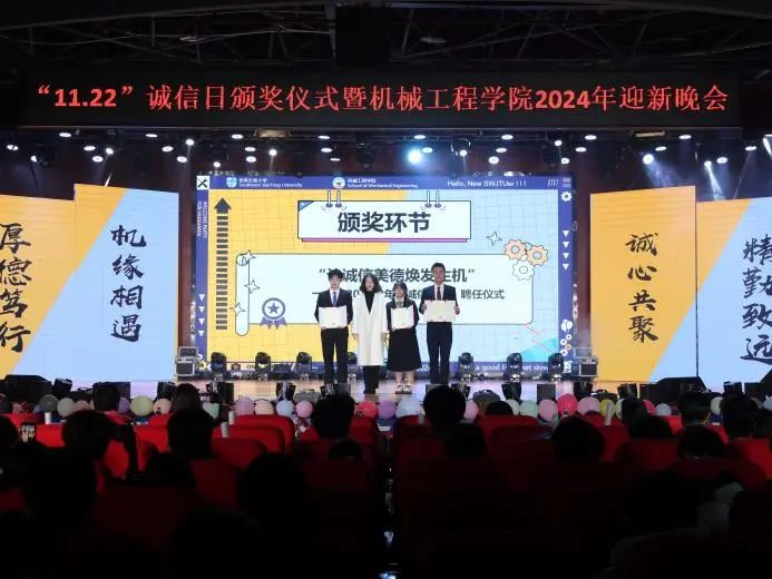 2024年11月17日,“机缘相遇·诚心共聚”11.22诚信日活动颁奖仪式在犀浦校区二食堂三楼隆重举办。“赏古典折扇之美,扇中华诚信之风”诚信折扇设计比赛获奖者、“诚信立身,筑梦前行”文创图案设计比赛获奖者郑重的走上舞台接受颁奖。“让诚信美德焕发生机”校园诚信大使历经层层选拔,最终,由黄清晗、于浩然、马健翔三位同学光荣担任,用优秀践行榜样的力量,诠释诚信的真谛。