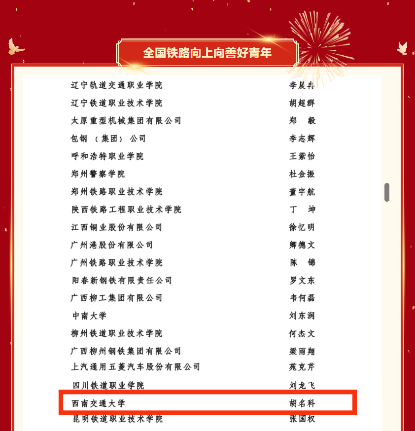 BBV体育_BBV(中国)胡名科获评2024年度“全国铁路向上向善好青年(创新创效)”荣誉称号