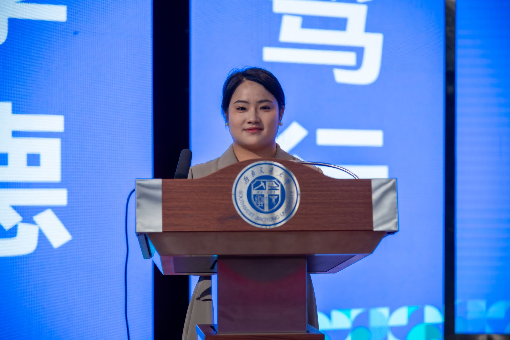 罗洪代表本科2025级新生辅导员发言。她谈到,辅导员的职责就是辅同学们成长,导同学们方向,“员”同学们梦想。她结合自己在大学阶段的学习生活和成长故事,向同学们分享了三点思考:一是努力学习专业知识,提升专业素养;二是勇于突破舒适区,拓展能力边界;三是不断反思总结,在自省中实现成长。