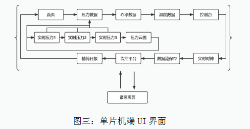 在旧版本的UI设计中,整个页面的切换逻辑都只有一层,这样的控制逻辑过于简单,内容呈现也过于单调,所以在新设计的UI中,我加入了“子页面”,页面循环不再是单层逻辑,而是两层循环,单片机端可以进入子页面进行循环,也可以在第一层页面循环,并且内容更加丰富了。单片机端的框图见图三: