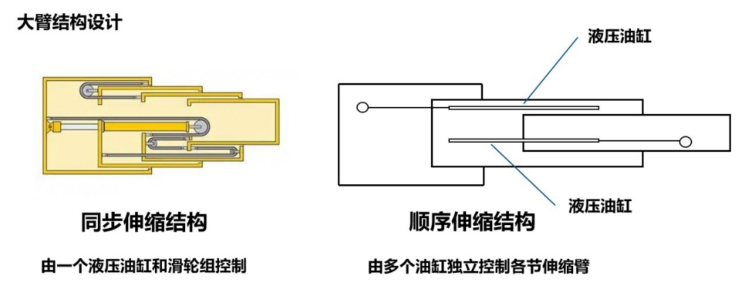 (3)确定了凿岩台车机械臂的总体结构设计方案,主要分为两部分,一是机械臂大臂的结构设计,二是机械臂推进机构的结构设计。在大臂的结构设计中,决定采取伸缩臂的形式,以提升结构的紧凑性和凿岩台车运动的灵活性。伸缩臂结构采取同步伸缩结构,与顺序伸缩结构相比,减少了所需液压缸的数量。同时,由于顺序结构需要为每节伸缩臂都配置一个独立的油缸,而液压油缸在全缩状态下自身也具有一定的长度,这种结构降低了轴向尺寸利用率。而同步伸缩结构通过滑轮组与液压缸相连的方式实现了各节伸缩臂同步运动的功能。结构更加简单,适用于凿岩台车机械臂设计中。在推进机构的设计中,选用液压缸—钢丝绳的推进方式,这种方案结构简单,成本较低,是一种可行性较高的方案。