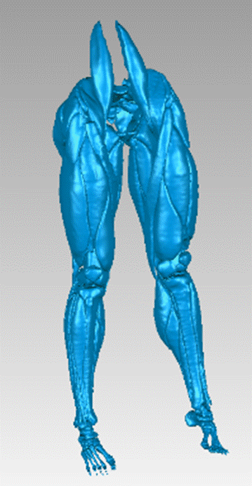 (4)获取人体下肢模型。本论文主要研究车辆运行时对人体下肢造成的影响进而优化车辆座椅,其中人体下肢骨肌模型通过美国University of Denver官方网站提供的男性下肢骨肌模型(39M, 71in., 90kg, 27.8BMI)CT扫描模型获取STL格式模型。