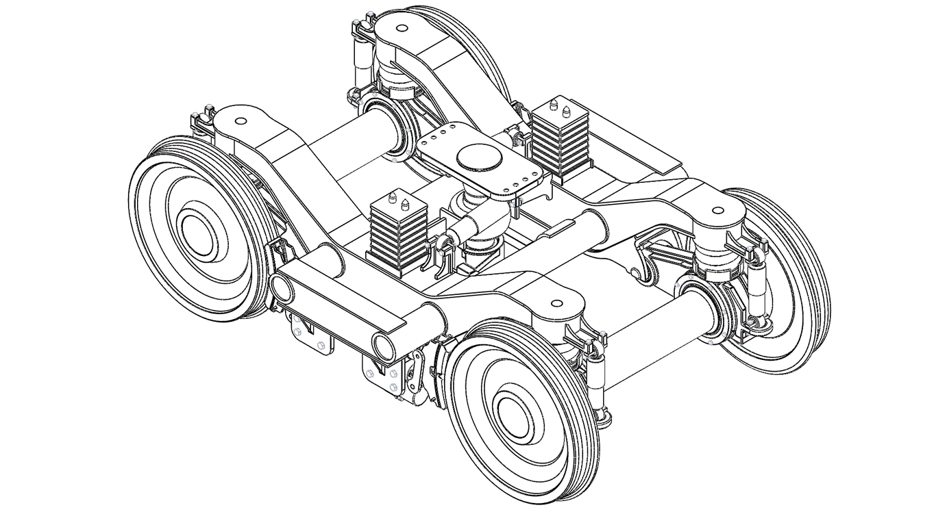 转向架二系悬挂采用橡胶堆结构,保障车体与构架间垂向刚度的同时,利用橡胶堆剪切刚度较小的特点,使转向架可以顺利通过小半径曲线,同时起到吸收垂向的振动能量的目的,二系静挠度是38mm。由于二系悬挂挠度较小,刚度较大,可以根据情况调整转向架左右侧梁上二系支撑力的大小,故无需布置抗侧滚扭杆: