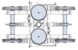 4构架采用焊接构架,由左右箱型侧梁和无缝钢管横梁焊接而成,构架上还焊有与一系悬挂装置、二系悬挂装置、制动装置及牵引装置连接的安装座。