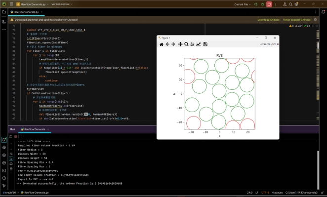 在材料参数方面,分别研究了使用复合材料设计零件的常用方法,即均匀化尺度之间的弹性刚度特性,从而提供有效弹性特性的估计值。代表体积元(RVE)均质化方法可以更准确计算等效弹性模量。因此本文使用顺序多尺度的方法,编写Python脚本完成了随机纤维分布RVE建模,如图所示。在随机纤维建模过程中,玄武岩纤维直径为10um,RVE体积为50um×50um×50um,纤维体积分数为60%,使用逐层搜索的方式来实现随机纤维建模,最后利用参数化建模在Abaqus中完成建模。