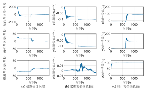 结果分析:图4(b)、(c)的陀螺常值漂移和加计常值偏置估计曲线表明,机动拐弯前,两个水平陀螺常值漂移仅得到部分估计,水平加计常值偏置无法估计;机动拐弯后,的估计精度均得到显著提高,接近理论值。惯性器件误差估计精度的提高,有效改善了方位角和两个水平姿态角的估计精度,如图(a)所示。以上结论与机动拐弯能够提高姿态误差的可观测度,进而提高姿态误差估计精度的可观测性分析结果相符。