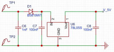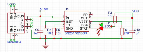 对于无线使用的低功耗蓝牙模块,需要解决充电与电源储存电路。本次毕业设计中设计了线圈无线充电和USB充电两种充电方式。通过整流二极管,线性稳压器78L05S,多个储能电容电路(如图9所示),得到稳定的5V电压,并输入电源管理模块中进行充电。USB充电方式(如图10所示)将MicroUSB中VBUS的5V供电端以及GND与电源管理模块BQS25170DSGR相连,实现充电功能。当电源充电时,STAT端口为低电平,VSET端口为高电平,LED2红灯导通,发出红光;当电源充电完成时,VSET端口为低电平,LED1绿地导通,发出绿光。