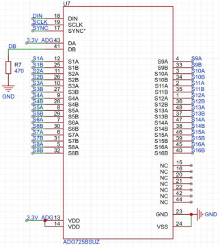 测量电路部分,为实现阵列测量,我们采用多路复用器(ADG725)实现行和列的切换,以时分复用的方式逐步扫描整个阵列,以实现阵列数据的实时监测。ADG725是一个双16路复用器,最高可实现16×16阵列的时分复用扫描测量,并且以三线制SPI通信,接口数量少,电路简单。将复用器的输出接入分压电路,将分压节点接入主控模块的ADC,从而实现对传感器的阻值测量(图7)。