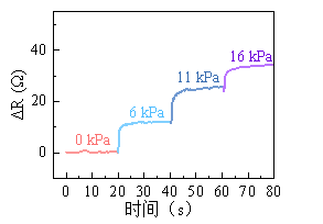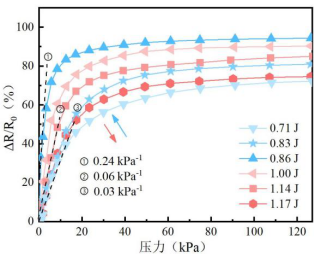 首先对不同刻蚀参数下的压力传感器的压敏曲线进行测试,结果表示,不同的激光刻蚀参数下,压力传感器的灵敏度和传感范围也不同。如15所示,LIG压力传感器的灵敏度范围为0.03~0.24 kPa-1,传感范围为20~60 kPa(S > 0.002 kPa-1),电阻变化率最高可达到94 %。随着相对激光能量的升高,压力传感器灵敏度先升高(0.71~0.86 J),而后逐步降低(0.86~1.17 J),这或许是由LIG中不同级别的结构起主导作用引起的。
