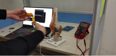 将所设计的柔性传感器与关节假体贴附,如图13a所示。同时打开上位机可视化视窗,在实现蓝牙从机,蓝牙主机,上位机之间的数据交互后,进行假骨实验,如图12所示。