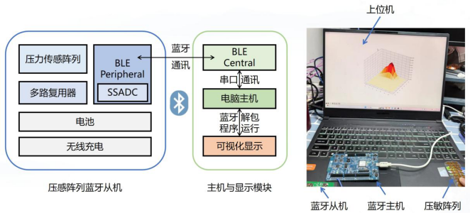 回答:压力传感器阵列通过多路复用器、上拉电阻和外部电源,将分压值输入蓝牙从机的模数转换器,同时打包整个阵列的数据并加上标志位,通过蓝牙将数据包无线传输到蓝牙主机,主机通过串口通讯将数据传输到上位机中进行蓝牙解包以及可视化显示。